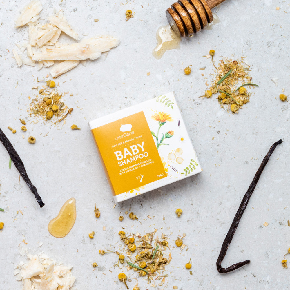 It’s time to get that silky tot squeaky clean. The Little Genie Goat Milk & Manuka Honey Baby Shampoo Bar is enriched with Vanilla Oil + Chamomile. Thoughtfully created with extra oils and nourishing ingredients for those little curls, you can really feel the difference as you hold the creamy shampoo bar in your hands.